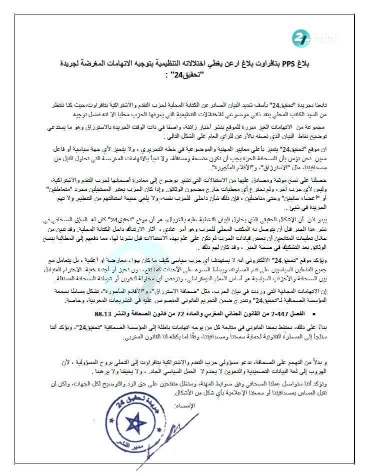 مباشرة بعد نشر هذا الخبر اصدرت الكتابة المحلية لحزب التقدم و الاشتراكية بتافراوت بيانا اعتبرته جريدة تحقيق 24 “بلاغا أرعنا”