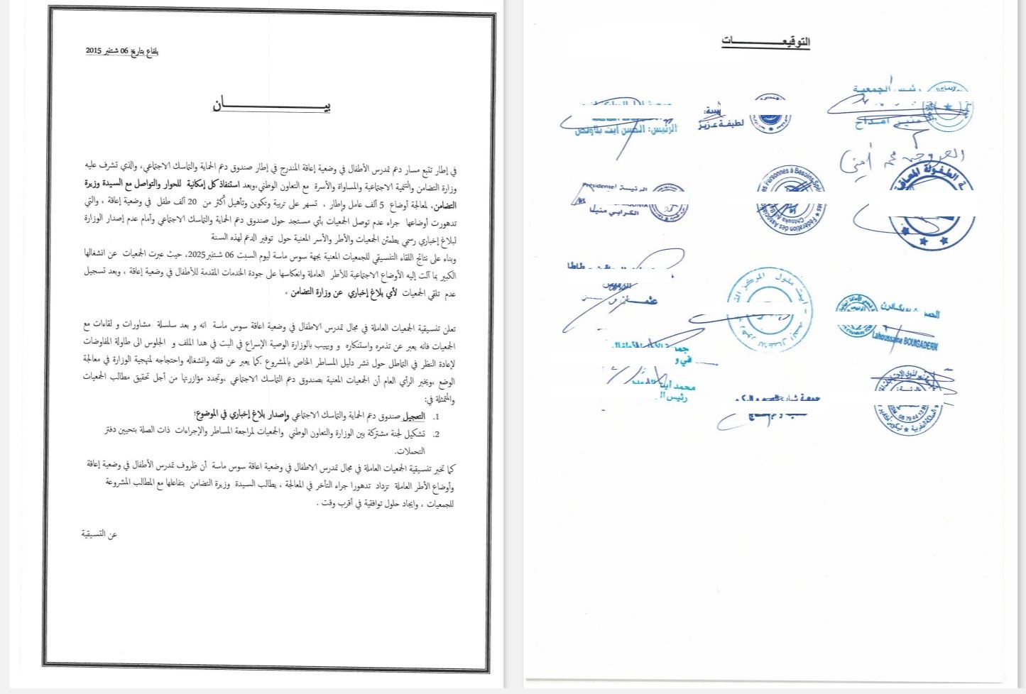 وختمت الجمعيات بيانها بدعوة وزيرة التضامن إلى التجاوب العاجل مع المطالب المشروعة والانخراط في حوار مسؤول، تفاديا لمزيد من الأزمات الاجتماعية والتربوية.
