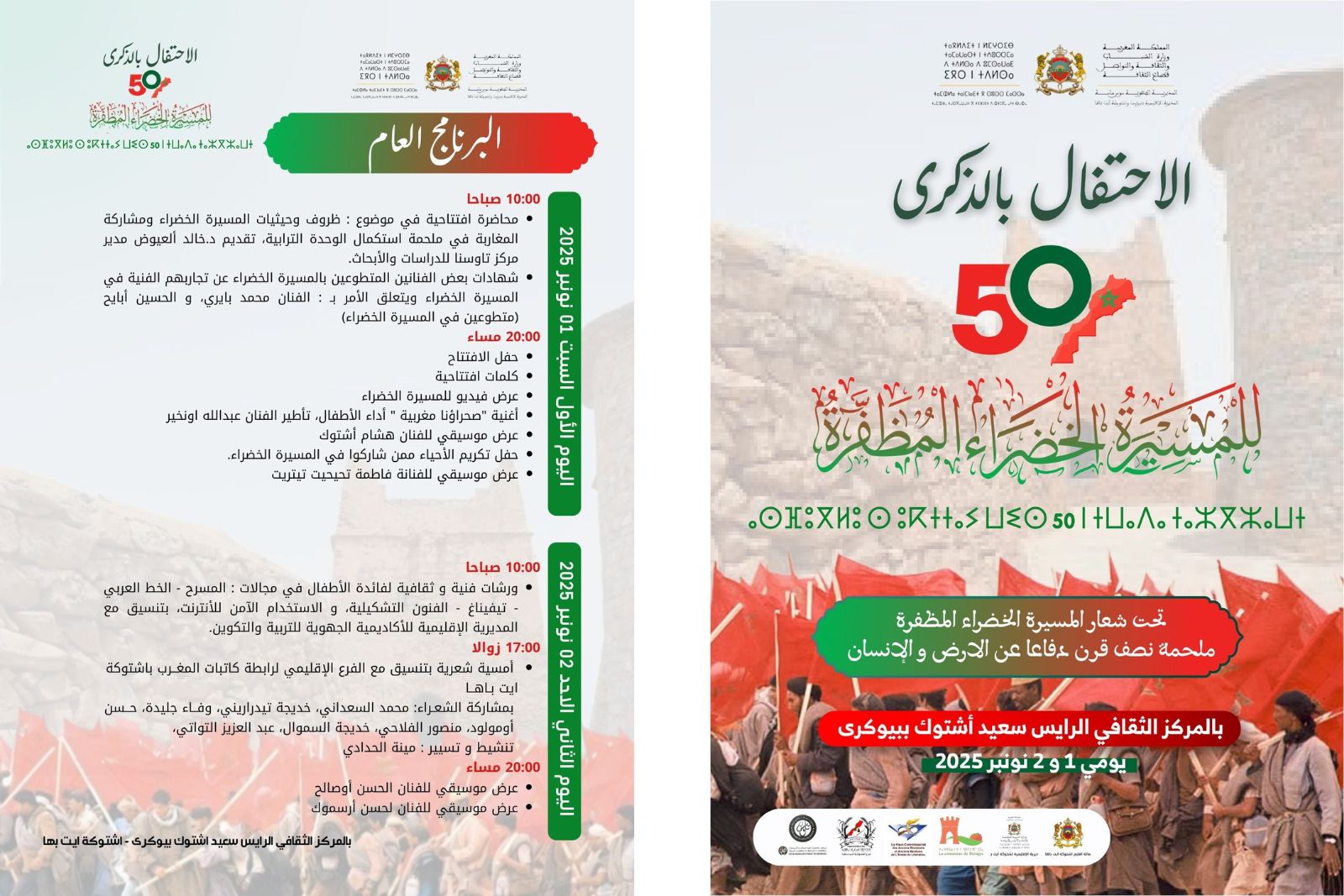 تنظم المديرية الإقليمية للثقافة بتيزنيت و اشتوكة آيت باها احتفالا ثقافيا و فنيا بمناسبة تخليد الذكرى الخمسين للمسيرة الخضراء المظفرة، يومي السبت 1 و الاحد 2 نونبر 2025 بالمركز الثقافي الرايس سعيد اشتوك ببيوكرى اقليم اشتوكة ايت بها ، تحت شعار: “المسيرة الخضراء.. ملحمة نصف قرن دفاعا عن الأرض والإنسان” ، بتعاون مع عمالة إقليم اشتوكة ايت باها، المجلس الجماعي لبيوكرى، المصالح الخارجية بإقليم اشتوكة شتوكة آيت باها ، و جمعيات المجتمع المدني.
