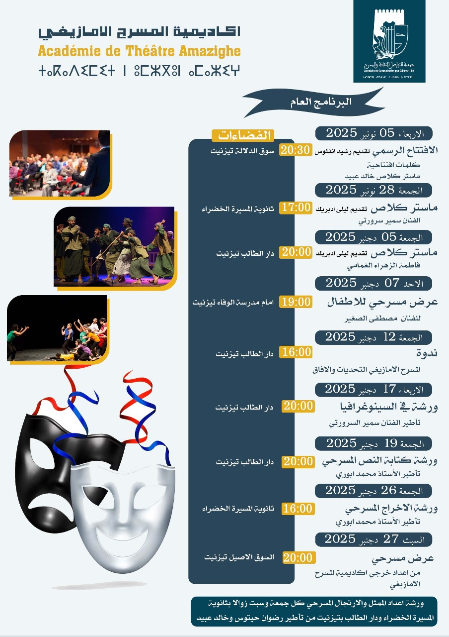 في إطار جهودها الرامية إلى النهوض بالمسرح الأمازيغي وتكوين جيل جديد من المبدعين في مجالات الأداء والإخراج والكتابة المسرحية، أطلقت أكاديمية المسرح الأمازيغي بتيزنيت برنامجها الفني والثقافي الممتد من 5 نونبر إلى 27 دجنبر 2025، متضمنا سلسلة من الورشات والعروض والندوات التي تجمع بين التكوين والممارسة والإبداع.