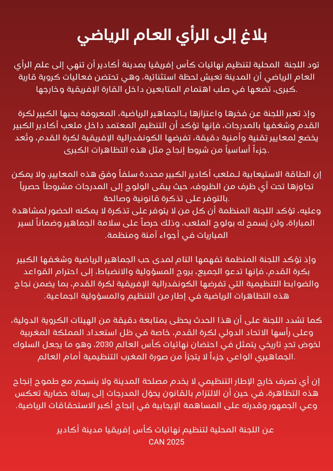 وإذ تعبر اللجنة عن فخرها واعتزازها بالجماهير الرياضية، المعروفة بحبها الكبير لكرة القدم وشغفها بالمدرجات، فإنها تؤكد أن التنظيم المعتمد داخل ملعب أكادير الكبير يخضع لمعايير تقنية وأمنية دقيقة، تفرضها الكونفدرالية الإفريقية لكرة القدم، وتُعد جزءاً أساسياً من شروط إنجاح مثل هذه التظاهرات الكبرى
