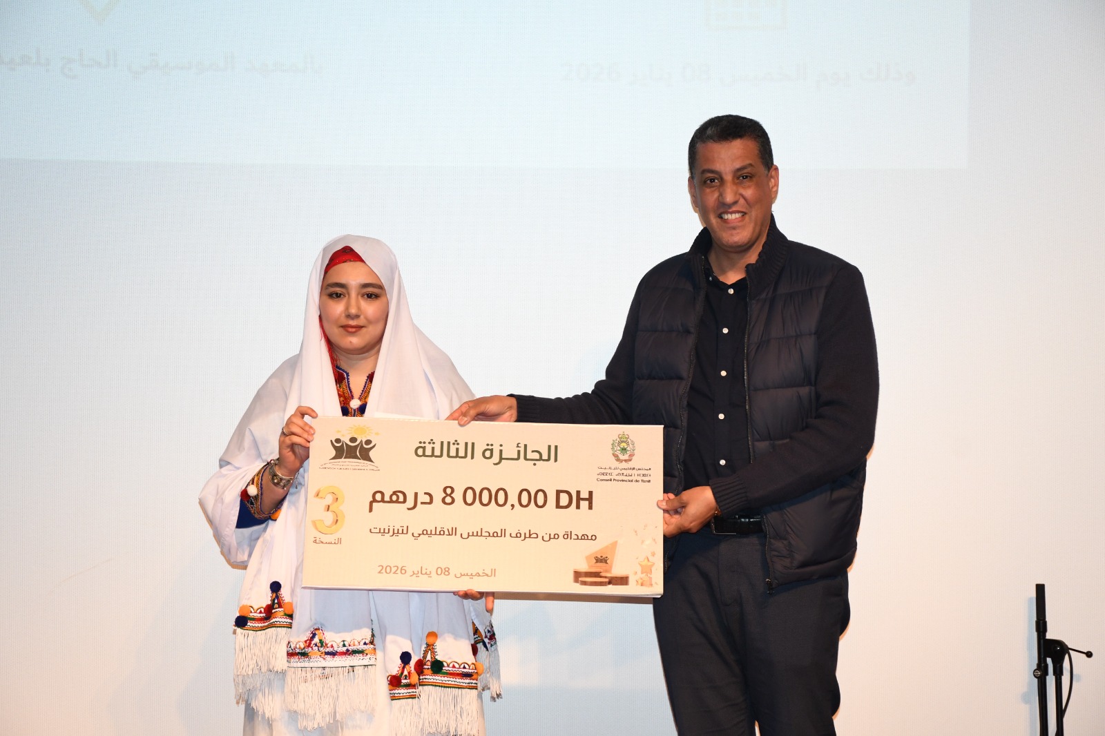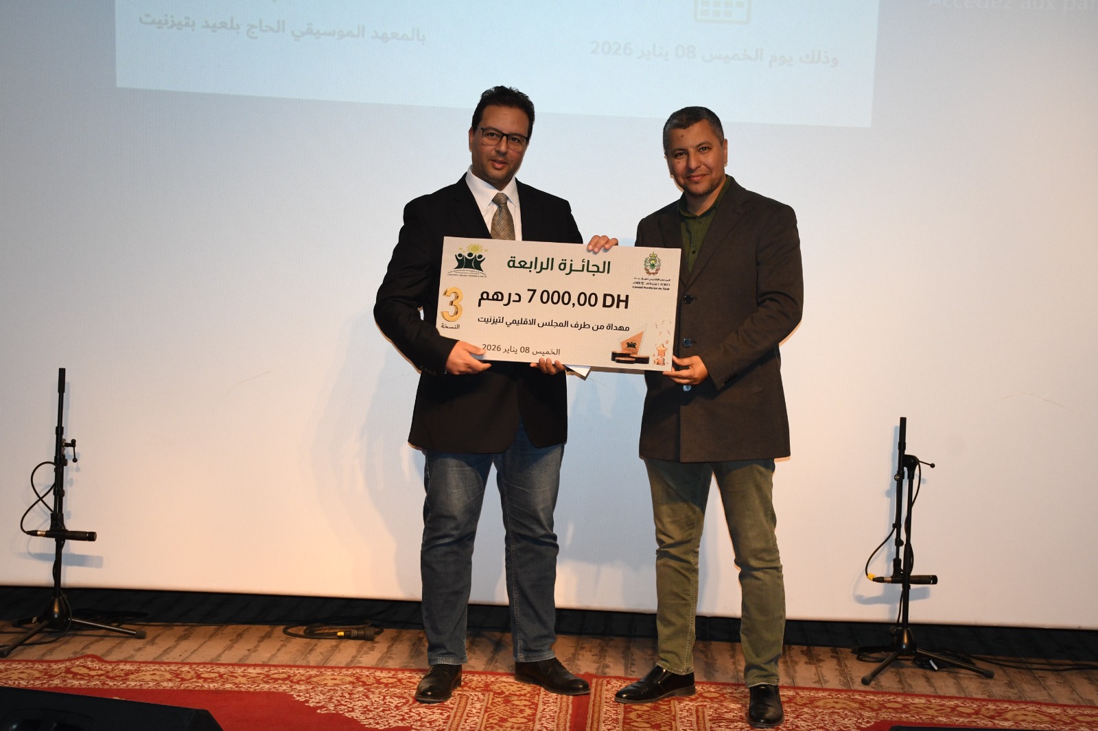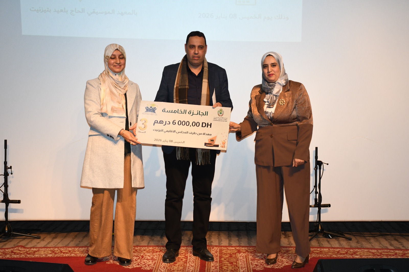 في اطار جهوده الرامية الى تثمين الراسمال البشري ودعم الطاقات الابداعية، نظم المجلس الاقليمي لتيزنيت، بشراكة مع جمعية الاعمال الاجتماعية لموظفي واعوان عمالة اقليم تيزنيت، مساء يوم الخميس 8 يناير 2026، بالمعهد المحلي للموسيقى والفن الكوريغرافي الرايس الحاج بلعيد بمدينة تيزنيت، حفل تتويج الفائزين في النسخة الثالثة من الجائزة الاقليمية للابداع والابتكار، المنظمة تحت شعار “الابداع هوية وتميز”.